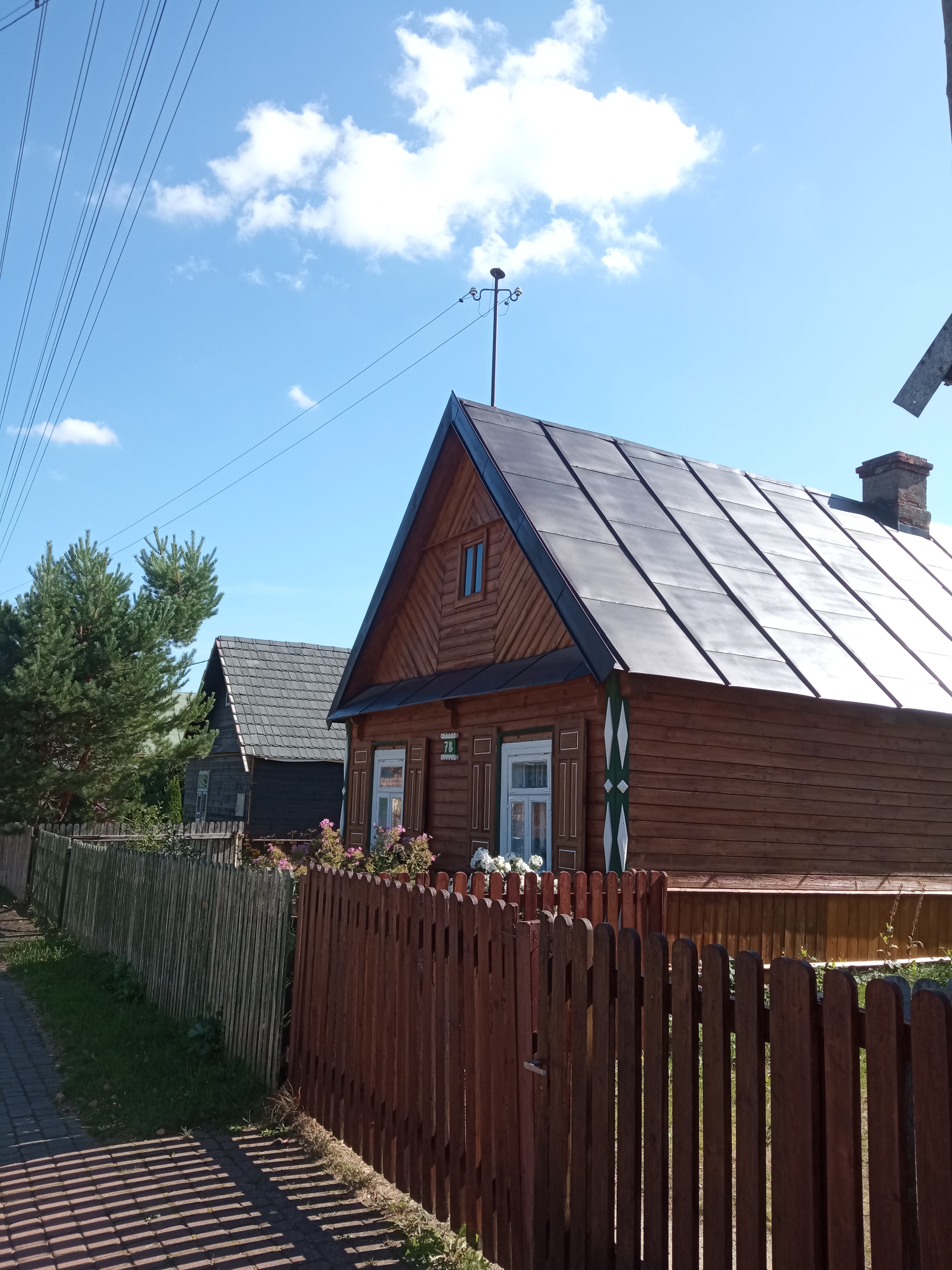 Obchodzę Białowieżę trochę bokiem ale po dwóch dniach jazdy samochodem mam ochotę sobie połazić. Mijam sporo drewnianych zabudowań, niektórych z okiennicami, tak charakterystycznych dla Podlasia. Uliczkami dochodzę do wspomnianego kościoła o naprawdę ciekawej architekturze przywodzącej na myśl kościoły obronne. Obiekt zaczął powstawać w 1927 roku. Nadal podziwiam drewnianą zabudowę robiącą klimat tego miejsca i dochodzę także do wcześniej wspomnianej ceglanej cerkwi.